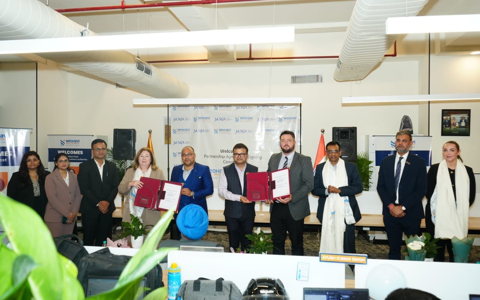 गुरुग्राम। मेधावी स्किल्स यूनिवर्सिटी (एमएसए) ने स्कॉटलैंड की स्कॉटिश क्वॉलिफिकेशंस अथॉरिटी (एसक्यूए) राष्ट्रीय पुरस्कार एवं योग्यता प्रदान करने वाली संस्था के साथ एक रणनीतिक साझेदारी की है, जो राष्ट्रीय शिक्षा नीति (एनईपी) 2020 के अनुरूप भारतीय उच्च शिक्षा और कौशल विकास के अंतरराष्ट्रीयकरण की दिशा में एक महत्वपूर्ण कदम जा रहा है। यूनिवर्सिटी के संस्थापक एवं कुलाधिपति प्रवेश दुदानी का कहना है कि समझौता समारोह में मार्गरेट करन, मार्क हिल, एलिसन बर्न्स और जॉर्ज कोलाथ, डॉ. निर्मलजीत सिंह कलसी उपस्थित रहे। उनका कहना है कि यह साझेदारी भारतीय शिक्षार्थियों के लिए वैश्विक स्तर पर संरेखित अकादमिक और करियर मार्ग तैयार करने की दिशा में एक महत्वपूर्ण कदम है। इस समझौते के तहत मेधावी स्किल्स यूनिवर्सिटी ऐसे कार्यक्रम पेश करेगी, जो अंतरराष्ट्रीय मानकों के अनुरूप होंगे। यूनिवर्सिटी के सह-संस्थापक एवं प्रो-चांसलर कुलदीप सरमा का कहना है कि भारतीय विद्यार्थियों को रोजगारपरक शिक्षा भी इस समझौते के तहत कराई जाएगी, ताकि विकसित देश में चल रहे कौशल विकास अभियान को सफल बनाया जा सके।