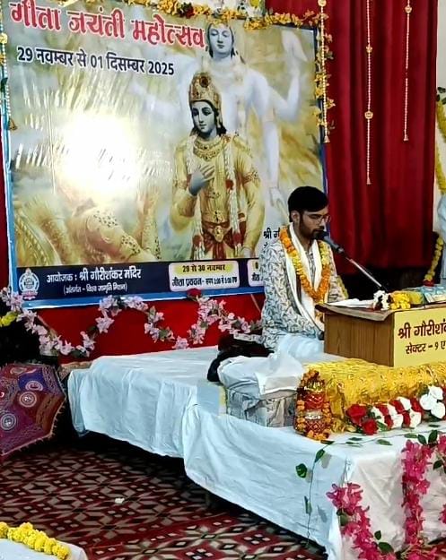 गुरुग्राम। गीता जयंती महोत्सव में गीता के महत्व को जीवन जीने की कला सिखाने, धर्म और सत्य के मार्ग पर चलने, और कर्म करने के साथ-साथ फल की चिंता न करने पर जोर दिया गया। इस दिन गीता के उपदेशों को आत्मसात करने, आत्मविश्वास बढ़ाने और जीवन की उलझनों से मुक्ति पाने का संकल्प लिया जाता है। कर्तव्य और कर्म करने के लिए प्रेरित किया जाता है। मनुष्य को अपने अपने कर्तव्यों का पालन निष्ठा और समर्पण के साथ करना चाहिए और फल की चिंता किए बिना कर्म करना चाहिए। उक्त उद्गार आचार्य हरीश उपाध्याय ने श्रीमदभगवद्गीता जयंती के उपलक्ष्य में विश्व जागृति मिशन के संस्थापक आचार्य सुधांशु महाराज की प्रेरणा से सैक्टर 9ए स्थित श्री गौरीशंकर मंदिर परिसर में आयोजित 3 दिवसीय श्री गीता जयंती महोत्सव में संगीतमय शैली में प्रवचन करते हुए व्यक्त किए। उन्होंने कहा कि गीता व्यक्ति को जीवन जीने की कला सिखाती है और पारिवारिक, सामाजिक व आध्यात्मिक जीवन के हर क्षेत्र में मार्गदर्शन करती है। गीता के उपदेशों को आत्मसात करके जीवन में सकारात्मकता और आत्मविश्वास लाया जा सकता है। धर्म और सत्य के मार्ग पर चलना जीवन का एक प्रमुख उद्देश्य है। गीता का नियमित पाठ मुक्ति, मोक्ष, शांति और ज्ञान प्रदान करता है। यह हमारे संदेहों को दूर करता है और आत्मविश्वास बढ़ाता है। कार्यक्रम में बड़ी संख्या में महिला, पुरुष श्रद्धालु शामिल हुए।