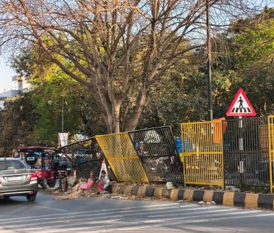 मुख्य सडक़ पर झूल रही हैं टूटी हुई लोहे की जालियां