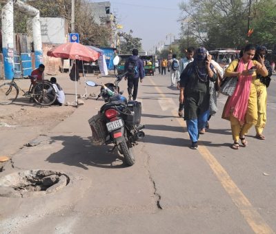 • मुख्य सडक़ पर झूल रही हैं टूटी हुई लोहे की जालियां